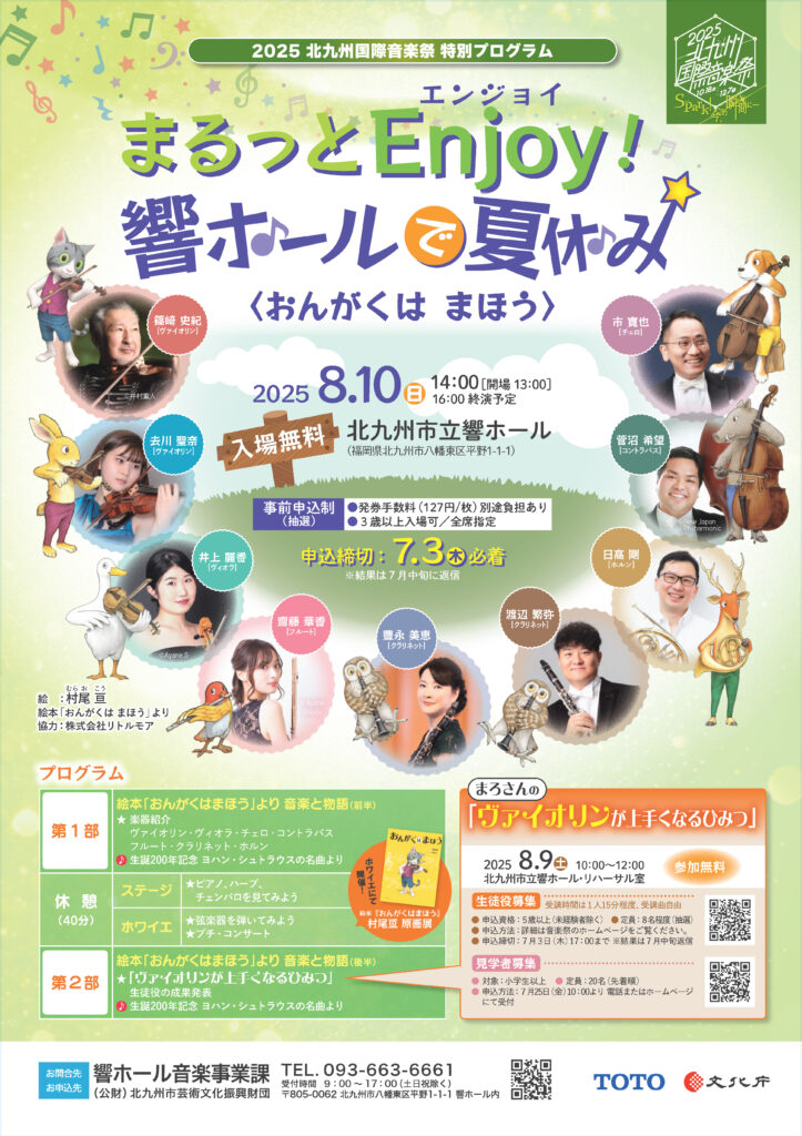 絵本『おんがくは まほう』を題材にしたコンサートが、2025年8月10日に北九州市の響ホールで開催されました。絵本の朗読とともにクラシック音楽の名曲が演奏され、ホワイエには絵本の原画も展示されました。